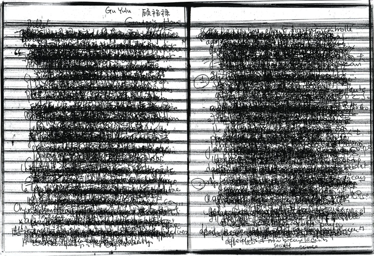 We used the Chinese equivalent of Blue Books to record our listening encounters—our time together was bound by the pages of the book. I collapsed all pages of notes from each listening session on top of one another to make site-listening exchange scores. I also wrote a short story about each listening encounter.