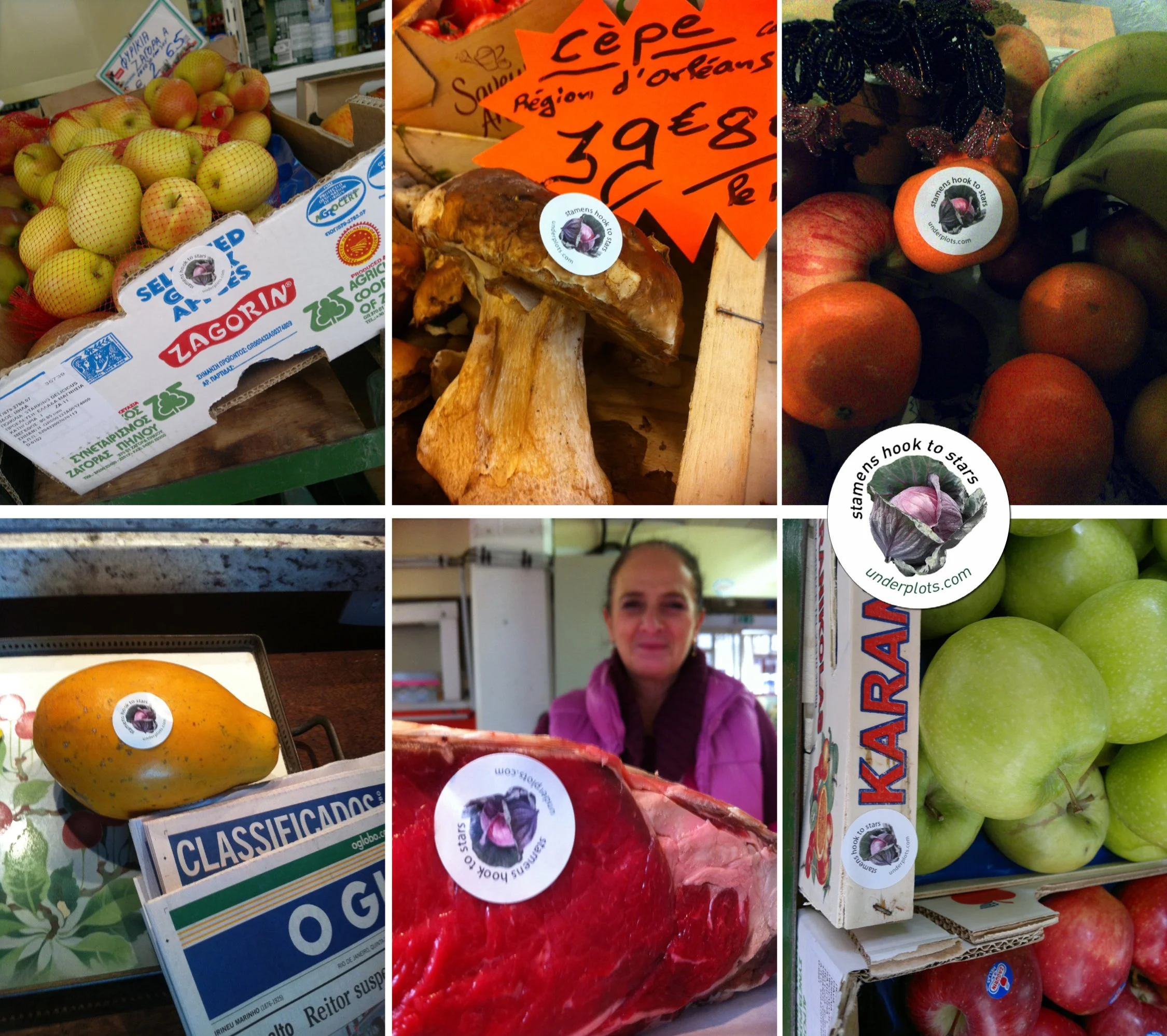 Originally a performance at Little City Gardens, an urban farm organized to look at food systems, community activation, environmental awareness, and urban land use. At the initial performance Susan and I passed out food stickers with Underplots printed on the label, and asked participants to place labels on food in markets they visited, take a photograph, and send to us.