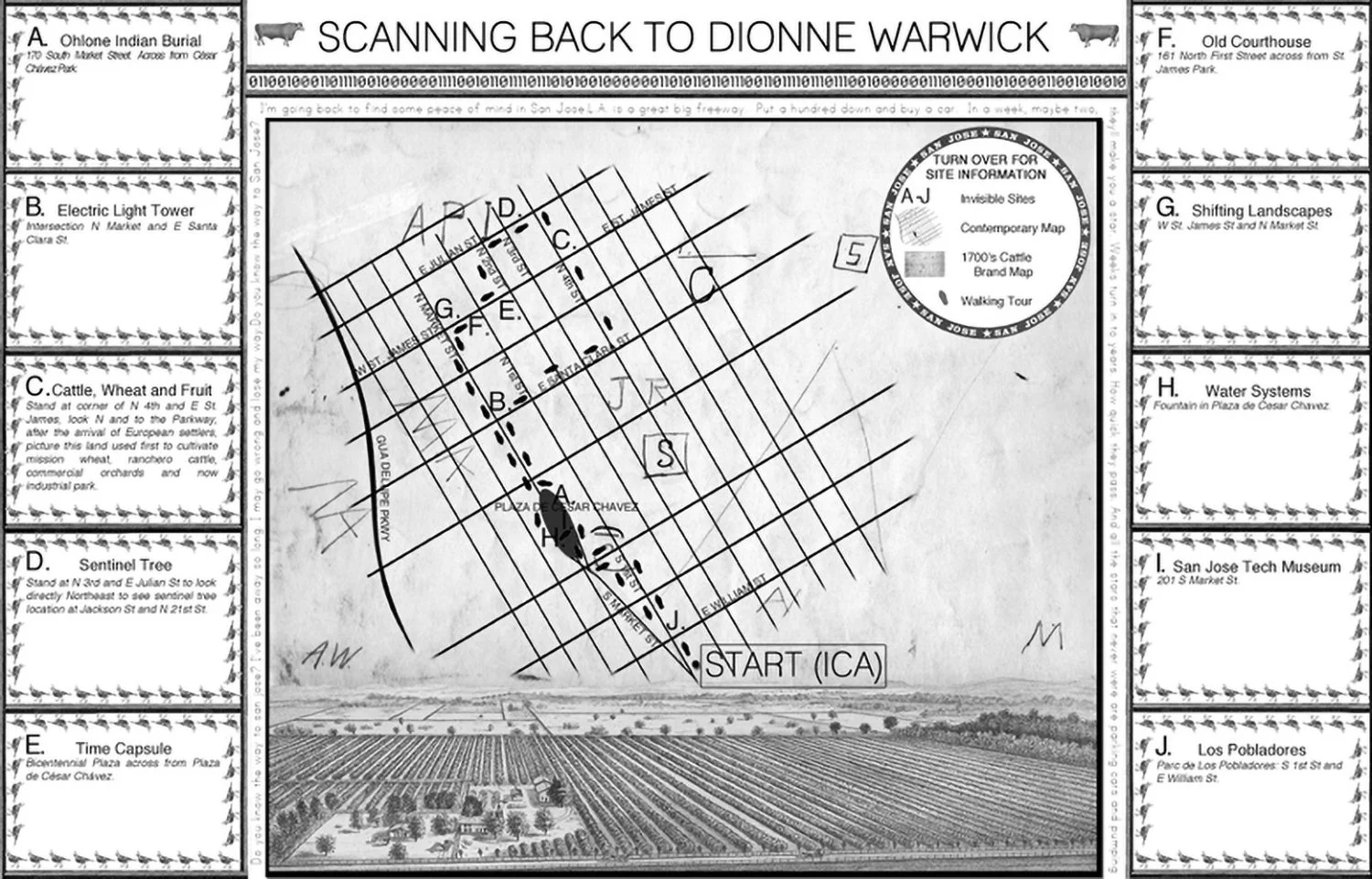 I pass out maps with images/ words/ song lyrics/ historical facts of what might have been at the location of what is now the street where the IEG fair is taking place at the ZERO1 Biennial.
