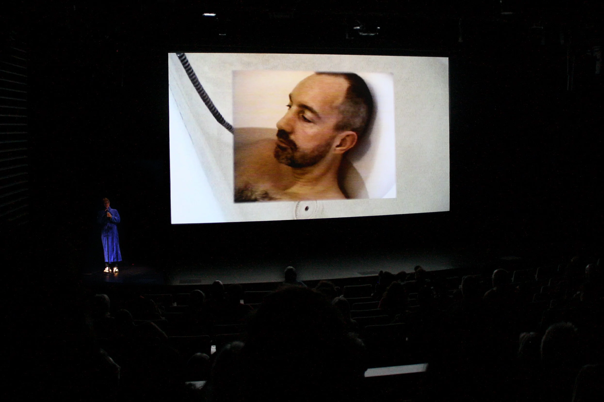 Improvisation for video and singer. The singer performs live in her bathrobe. Simultaneously, but purposely not in direct sync, the video plays on the video monitors. The video—of a man bathing, the sound of water and his humming, mixes with the live performance. The singer moves about the space. Bubbles fall from a bubble machine above the set.