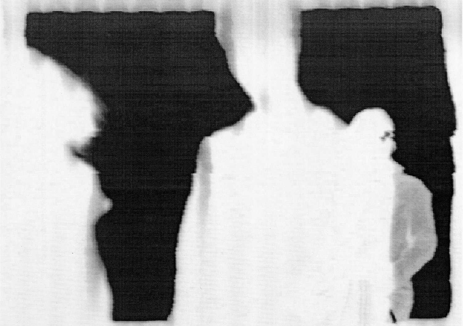 The light of a 16mm projector is cast through a doorway into a walkway of the museum, as viewers walk by they cast shadows. This shadow image is captured by a camera, transmitted to a computer, inverted and printed. Viewers are invited to take away their shadows. Made shortly after September 11, 2001.