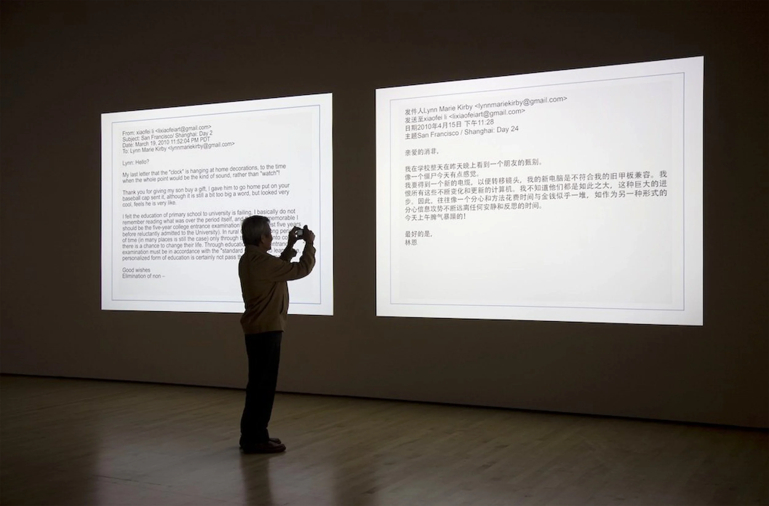 Li Xiaofei and I were paired as part of a San Francisco/ Shanghai Sister City Exchange. It seemed important to go to Shanghai to meet him. We met but did not speak a word of the other’s language. We used Google translate to communicate, and had such a good time that we continued our exchange via email for thirty days. During that time Google withdrew from China, adding more drama to our conversation. Our exchange became a two-screen video projection.
